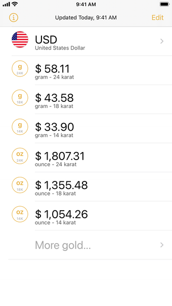 عند فتح التطبيق للمرة الأولى، سيتم الكشف تلقائيًا عن العملة الافتراضية الخاصة بك وعرض الأسعار لأوزان الذهب الشائعة والنقاوات. ومع ذلك، إذا كنت تفضل عملة مختلفة، يمكنك بسهولة تحديد إحدى العملات المدعومة الـ 160.